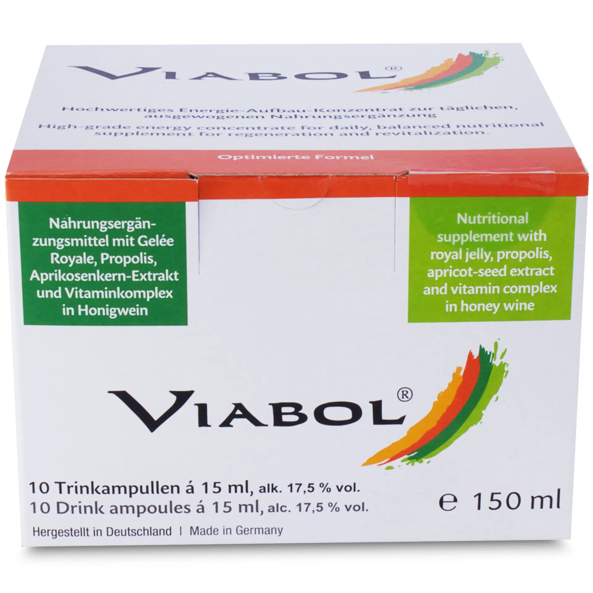 Notes The Best Way to Apply Tips Ingredients overview FIC 10 drinking ampoules of 15 ml Food supplement Viabol drinkable vials are a high-quality energy-building concentrate, especially for people who are exposed to exhausting stress: optimal for a broadband vitaminization, in case of professional and private stress for physical balance, suitable in case of susceptibility to infections (e.g. flu, colds, herpes), in case of digestive disorders, one-sided nutrition, feeling of weakness after infections, decrease in performance, rapid fatigue, prophylaxis in case of pollen allergy, with Biotin and Vitamin C. Not tested on animals - most valuable natural nutrients and vital substances - dissolved in residue-controlled honey wine. Notes With each Viabol ampoule they supply the body with valuable, coordinated nutrients and vital substances dissolved in residue-controlled honey wine. A mixture of various extracts of nature such as flowers, wheat germ, propolis, elderberry juice, apricot kernels and yeast can have a great effect as part of a cure with the broadband vitaminization. The Best Way to Apply During a Viabol cure (three to four times a year) drink one ampoule daily. Divide the contents of the vial into three doses a day and keep in the mouth for one to two minutes before swallowing. In this way, the nutrients are absorbed through the oral mucosa. Especially in case of additional stress (e.g. during the flu season), two to three vials can also be drunk throughout the day. Tips As a rule, we consume fewer vital substances, but have a higher consumption. Due to this disharmony, the body becomes less efficient, fatigued and ages sooner, and becomes more susceptible to illness. The Viabol drinking ampoules work most effectively in the context of a cure. This allows vitamin deficits in the store to be replenished. For more energy that accompanies you throughout the day. Ingredients overview: Via Nova Viabol drinking ampoules Honey wine, Flower pollen extract, Royal jelly, Wheat germ extract, Propolis extract, Elderberry juice concentrate, Apricot kernel extract, Yeast extract, Vitamin C, Niacin, Vitamin E α-TE, Pantothenic acid, Vitamin B6, Vitamin B2, Vitamin B1, Folic acid, Biotin, Vitamin B12 Product master data according to FIC Product name of food: Viabol® Drinking Ampoules Name of the food product:FOOD SUPPLEMENTwith royal jelly, propolis, apricot kernel extract and vitamin complex in honey wine Package size and PZN-No. of the food: 10 drinking ampoules á 15 ml (PZN-07553423) List of ingredients: Honey wine; flower pollen extract 16.2%; royal jelly 4.8%; wheat germ extract 1.6%; vitamin mixture with maltodextrin: vitamin C, niacin, vitamin E, pantothenic acid, vitamin B6, vitamin B2, vitamin B1, folic acid, biotin, vitamin B12; propolis extract 0.5%; elderberry juice concentrate; apricot kernel extract 0.2%; yeast extract Food ingredient information: Ingredients per ampoule (15 ml) Flower pollen extract (digested), multifloral 2500 mg Royal jelly 750 mg Wheat germ extract 250 mg Propolis extract 80 mg Elderberry juice concentrate 75 mg Apricot kernel extract 30 mg Yeast extract 20 mg Vitamin C 40.00 mg* Niacin 8.00 mg* Vitamin E α-TE 6.00 mg* Pantothenic acid 3,00 mg* Vitamin B6 0,70 mg* Vitamin B2 0,70 mg* Vitamin B1 0,55 mg* folic acid 100,00 μg* Biotin 25,00 μg* Vitamin B12 1.25 μg* * = corresponds to 50 % of the recommended daily allowance Net quantity of the food: ℮ 150 ml Storage instructions and/or directions for use: Please store out of reach of children! Not suitable for asthmatics and people suffering from atopy. Do not exceed the specified recommended daily intake. Food supplements should not be used as a substitute for a balanced, varied diet and a healthy lifestyle. Protect from heat! Company address of the food business operator: Via Nova Naturprodukte GmbHReinhartser Str. 25D-87437 Kempten / Allgäu Country of origin for the food: Germany Alcohol content in % by volume: alk. 17.5 % vol. Nutritional declaration: Please note that food supplements are exempt from mandatory nutritional labeling. Allergens: wheat germ extract Directions for use: Daily divide the contents of one drinking ampoule into 3 or more doses and leave in the mouth for about one minute before swallowing. Status | Declaration: 01.01.2018 Update 09.08.2023