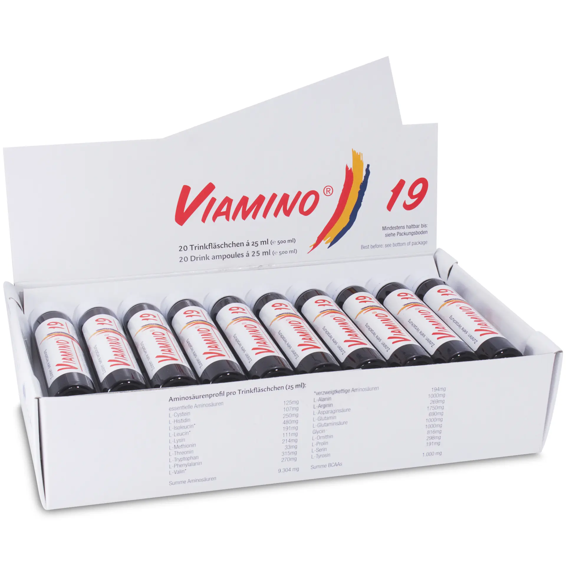 Viamino 19 drinking ampoules contain 20 important amino acids from natural raw materials for their health and your performance: