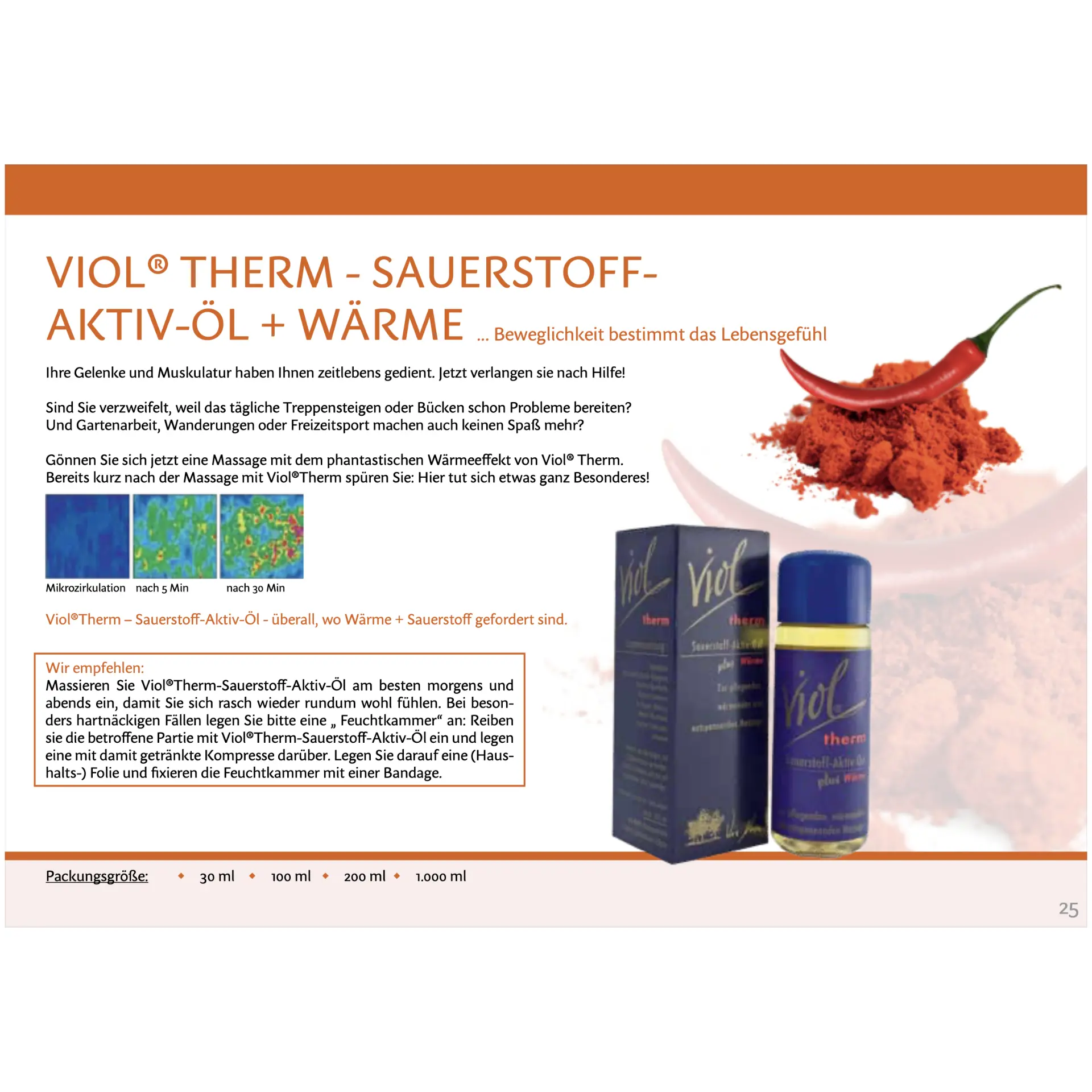 Anmerkungen Anwendungsempfehlung Tipps Wirkstoffe Inhaltsstoffe Körperpflege Viol Therm – überall, wo Wärme + Sauerstoff gefordert sind. Anmerkungen Ihre Gelenke und Muskulatur haben ihnen zeitlebens gedient. Jetzt verlangen sie nach Hilfe! Sind sie verzweifelt, weil das tägliche Treppensteigen oder Bücken schon Probleme bereiten? Und Gartenarbeit, Wanderungen oder Freizeitsport machen auch keinen Spaß mehr? Gönnen sie sich jetzt eine Massage mit dem phantastischen Wärmeeffekt von Viol Therm. Bereits kurz nach der Massage mit Viol Therm spüren sie: Hier tut sich etwas ganz Besonderes. Anwendungsempfehlung Privater Gebrauch Auftragen und sanft einstreichen. Professioneller Gebrauch Sanft einmassieren. Tipps Zuerst an einer kleiner Körperstelle austesten. Für dünnere Haut, erhöhte Empfindungsamkeit und als Einstieg empfehlen wir das nicht kühlende und nicht wärmende Viol Aktiv. Bei Unsicherheiten zu diesem Produkt dürfen sie uns gerne anrufen. Wirkstoffe Erdnuss-Öl aus den Samenkörnern - macht geschmeidig - bietet Pflege und Schutz. Eukalyptus-Ölstammt aus der Familie der Myrtengewächse, dem Fieberbaum. Das Öl wird aus den Blättern gewonnen. Capsicum-Extraktpflanzlich, gilt als empfehlenswert. Kann die Hautdurchblutung stimulieren. Inhaltsstoffe: Viol Therm wärmendes Massage-Öl arachis hyogacea oil, peg-40 sorbitan peroleate, ricinus communis seed oil, eucalyptus globolus leaf oil, methyl nicotinate, helianthus annuus (sunflower) seed oil, capsicum frutescens fruit extract. Update 09.08.2023
