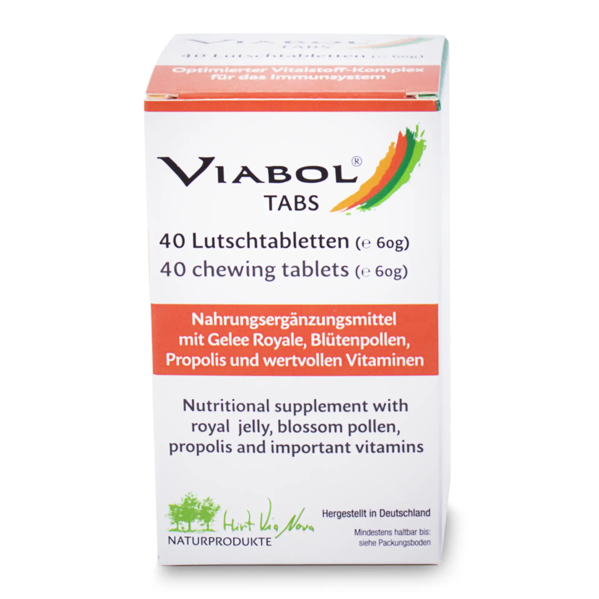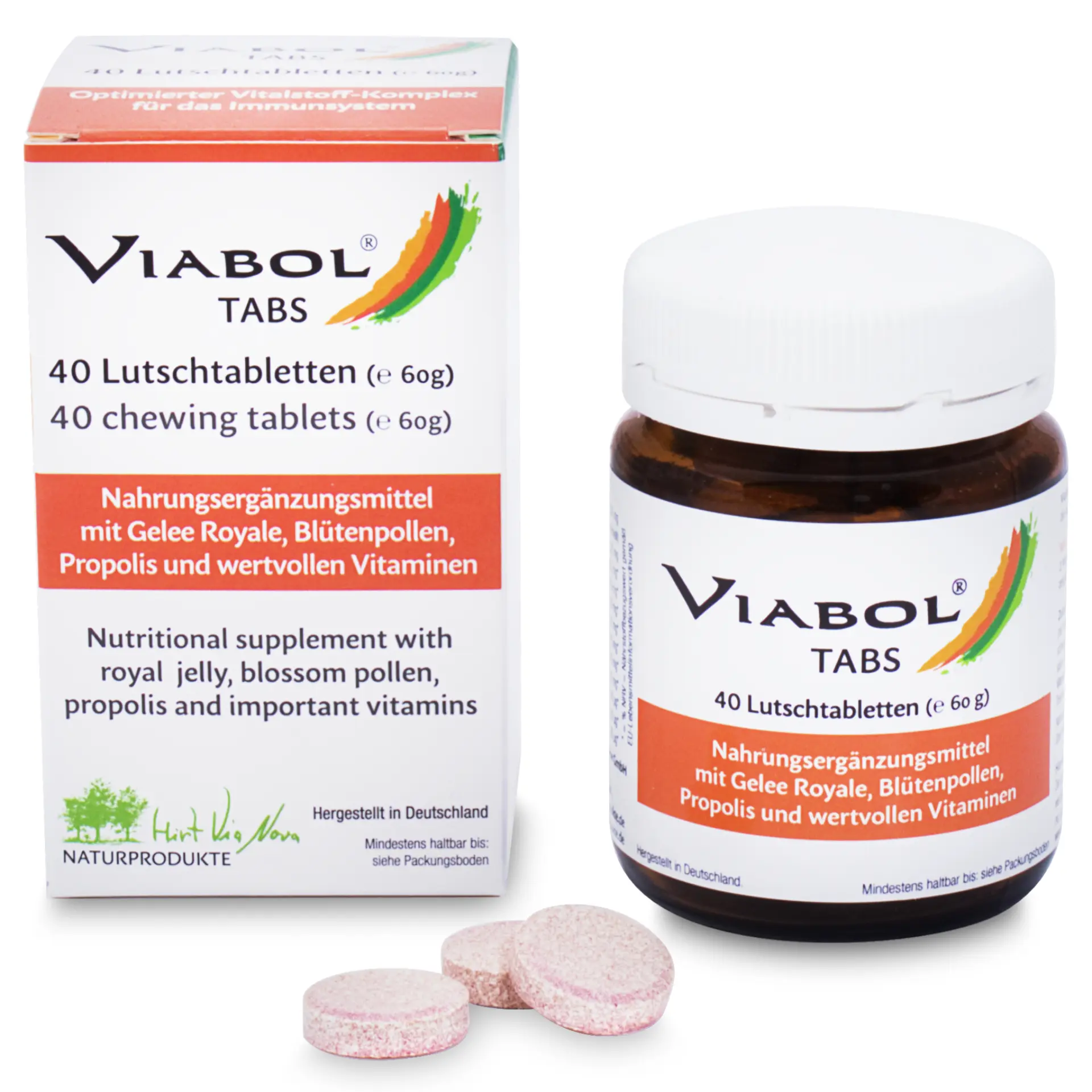 - Verzehrsempfehlung: 2 Viabol®-Tabs Lutschtabletten pro Tag langsam im Mund zergehen lassen.
