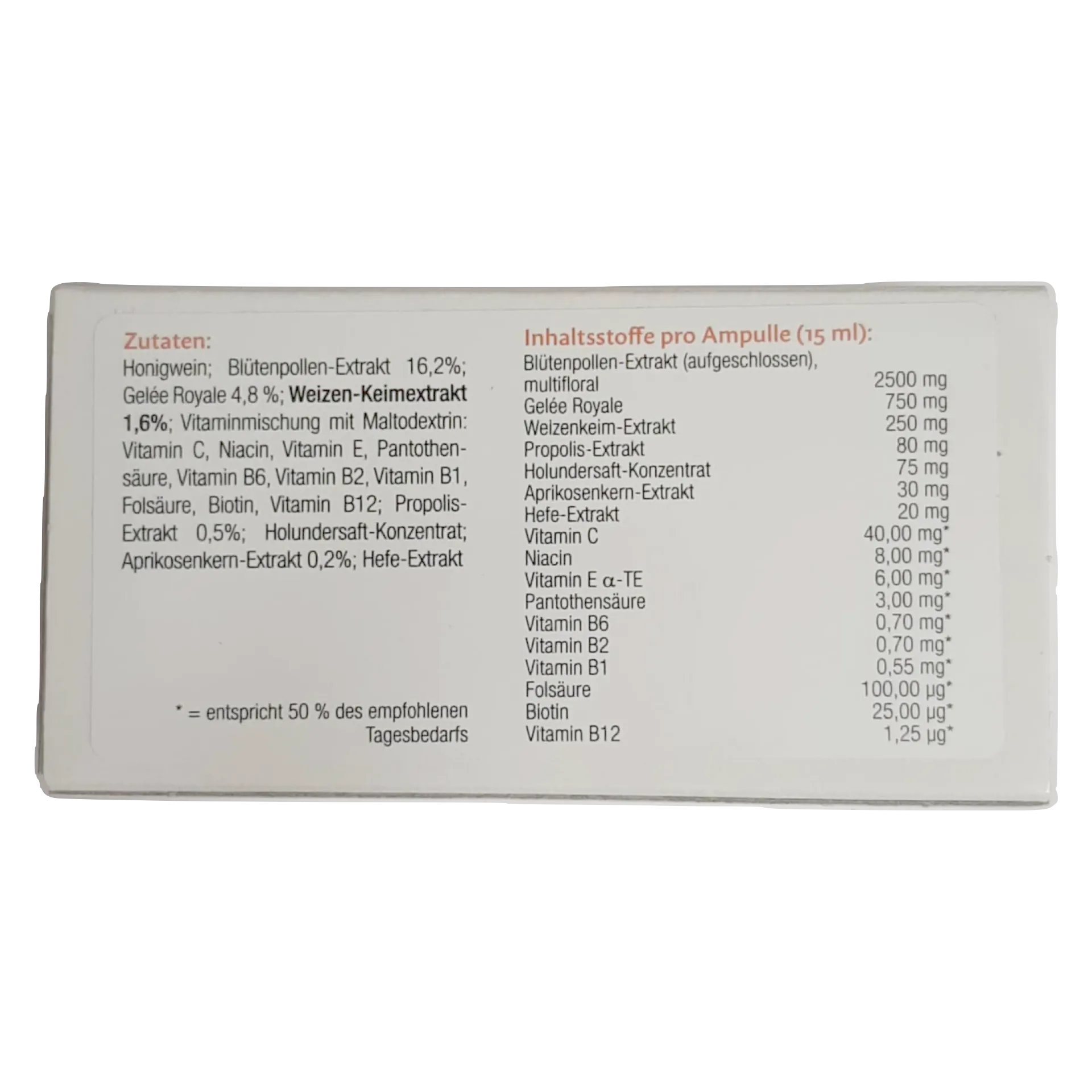 - Zutatenverzeichnis: Honigwein; Blütenpollen-Extrakt 16,2%; Gelée Royale 4,8 %; Weizen-Keimextrakt 1,6%; Vitaminmischung mit Maltodextrin: Vitamin C, Niacin, Vitamin E, Pantothensäure, Vitamin B6, Vitamin B2, Vitamin B1, Folsäure, Biotin, Vitamin B12; Propolis-Extrakt 0,5%; Holundersaft-Konzentrat; Aprikosenkern-Extrakt 0,2%; Hefe-Extrakt