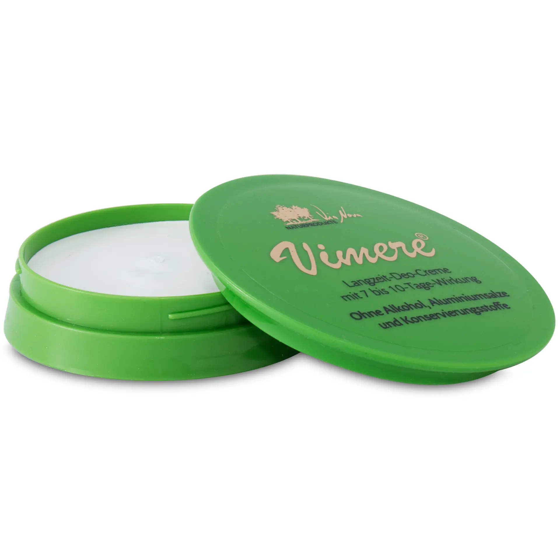 Vimere Deo Creme ist ein ganz anderes Deo. Es entzieht bis zu zehn Tage lang den Hautbakterien und -pilzen die Lebensgrundlage. Vimere besteht aus wertvollen Natursubstanzen - ohne Aluminium und nutzt Vitamin C als natürliches Konservierungsmittel.